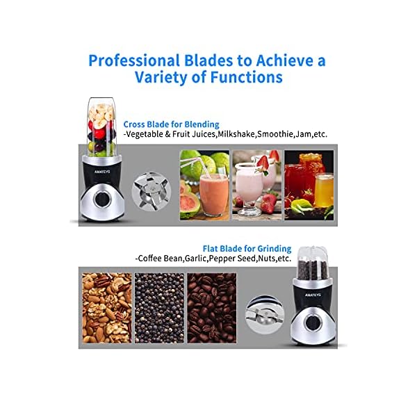 Grinding & Blending: 2-leaf flat blade and 4-leaf cross blade combine the grinder and mixer together, realize functional diversification. Amateys grinder and blender set can not only make smoothies, vagetable & fruit juices ,milkshakes, jam, baby food, but also grind coffee beans, spices and nuts into powder.