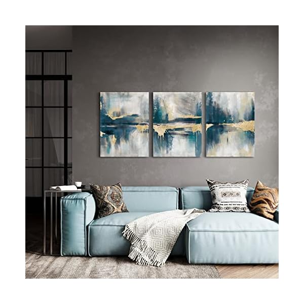 ArtbyHannah Blue and Gold Abstract Canvas Wall Art, 3 Panels Modern Blue Wall Art Decor for Bedroom Bathroom, 12×16 Inch…